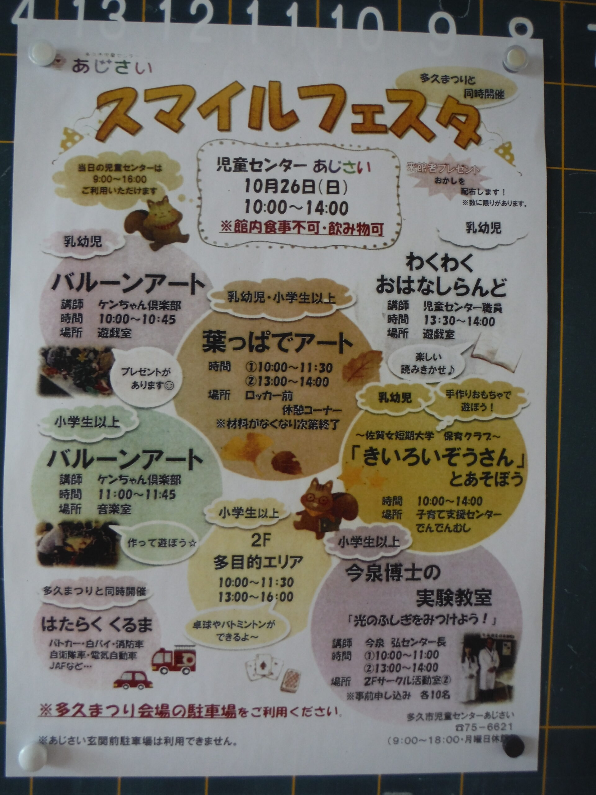今月10月26日(日)、多久市の児童センターあじさいで行われる『スマイルフェスタ』に出店します(たくまつりと同時開催)。 フェスタでは菓子・小物等を販売します。 出店時間は10:00~14:00です。(なくなり次第終了) 宜しくお願いたします。